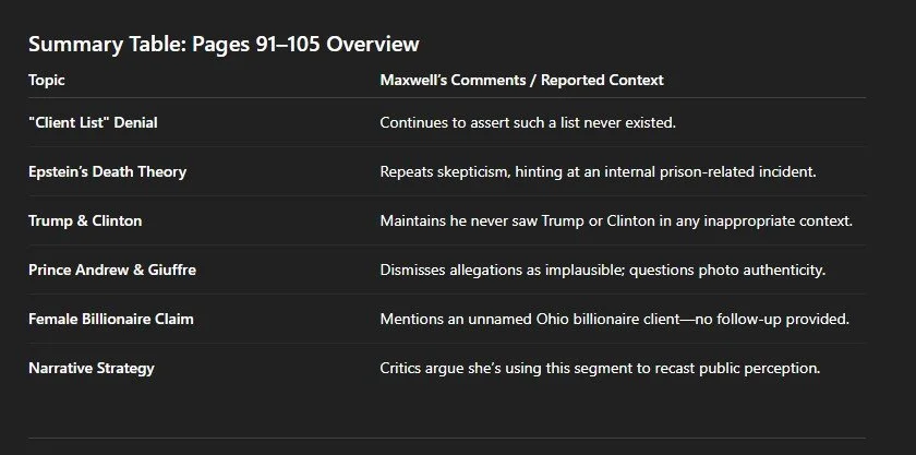 Maxwell’s statement: She insists she had no knowledge of Epstein’s supposed suicide or the circumstances of his death. She portrays herself as shocked, claims she only heard the news after the fact, and denies having any insight into what really happened.